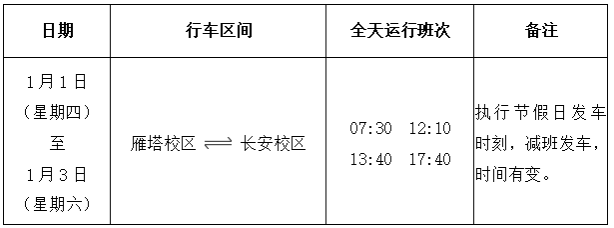 根据我校《关于2026年元旦放假调休的通知》安排,2026年1月1日(星期四)至1月3日(星期六)放假,值班时间为8:30—12:00,14:30—17:30。现将放假期间通勤班车运行时间调整如下: