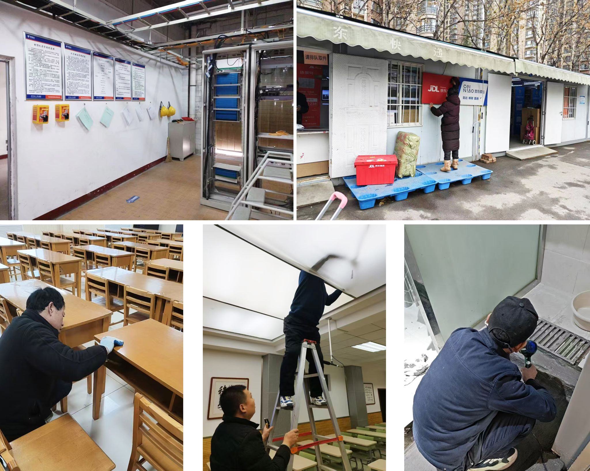 通讯与快递服务中心对快递服务大厅的消防设施、核心机房的备用电源系统、配电控制柜及通信配线设备进行全面检查与维护,确保通讯系统稳定可靠;工程服务中心积极推进各项未完工项目的跟进工作;维修服务中心逐个检修两校区学生宿舍、教室等公共区域的地砖、楼道灯、消防门及水房设施,为即将开始的校园生活和教学安排做好充足准备。