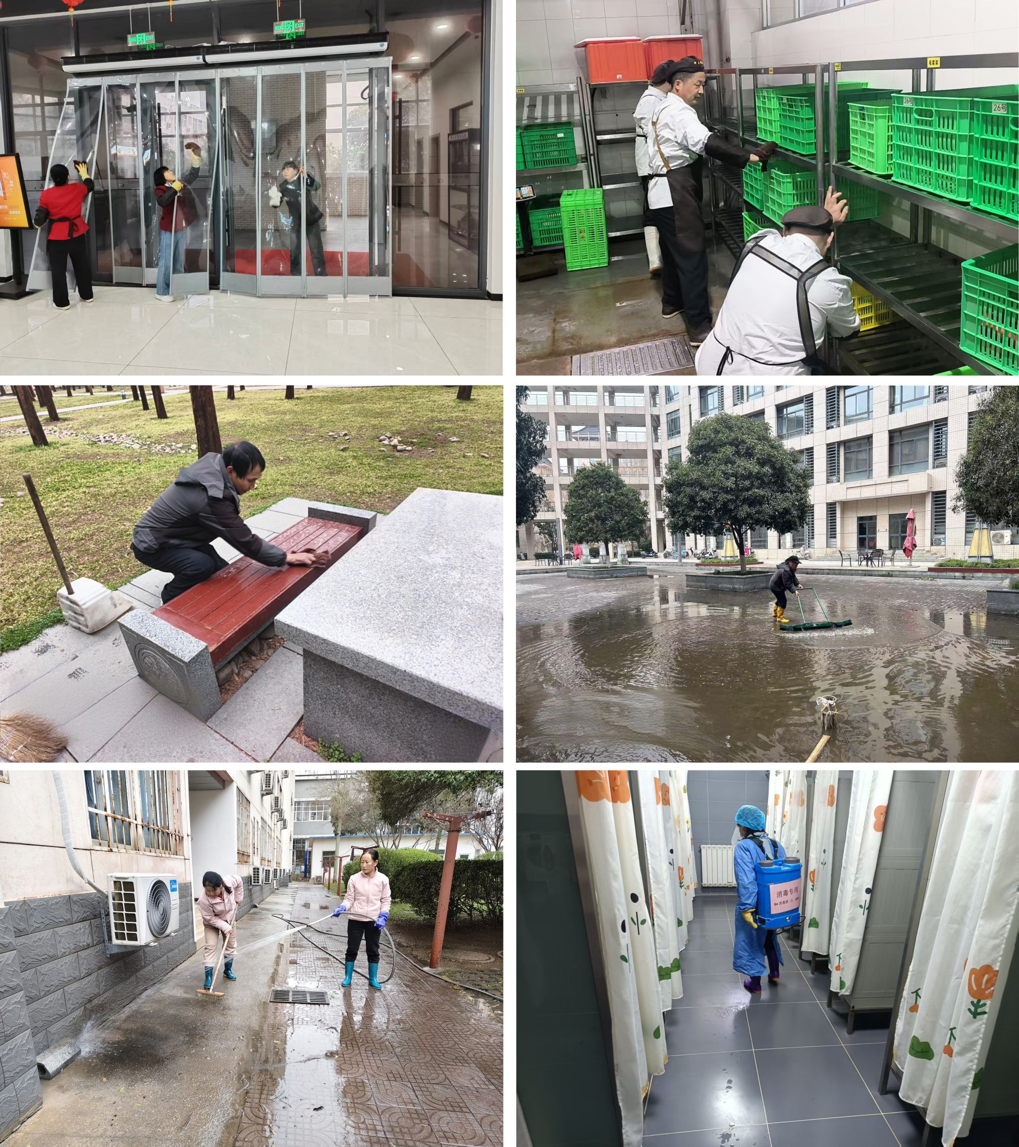 为营造优美整洁的校园生活环境,各中心(部、室)多次开展卫生大扫除活动。饮食服务中心、学生公寓服务中心、物业服务中心、学术服务中心分别针对食堂、宿舍、浴室、教室、宾馆等高频使用场所进行深度保洁和消毒,全面清除卫生死角。